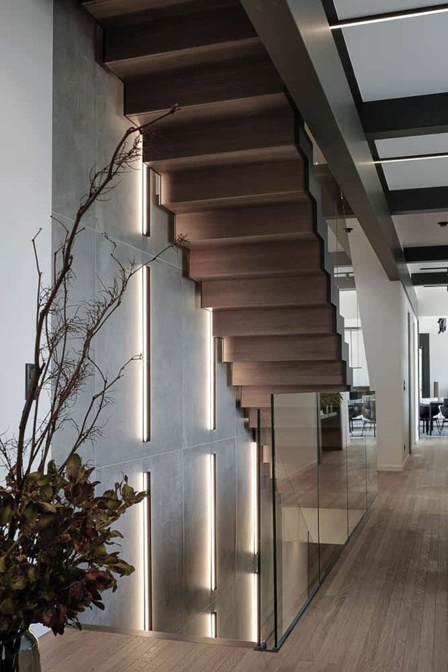 À l’intérieur, l’espace devient manifeste. Le béton, le chêne et le verre s’y répondent dans un dialogue de matières, tandis que la lumière sculpte les volumes.